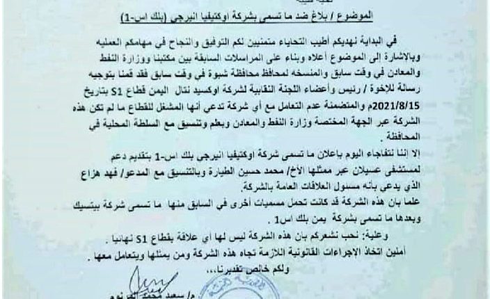 وأوضحت وثيقة صادرة من مكتب النفط والمعادن بالمحافظة بتاريخ 23 أبريل الماضي، موجهة للمحافظ عوض الوزير العولقي، أن شركة “أوكتيفيا انيرجي بلك S1، كانت تحت مسميات متعددة منها “بيتسيك”، واسم “يمن بلك S1”.