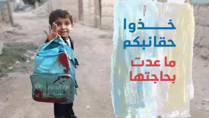 كما قدم الطلاب والطالبات خلال وقفتهم الاحتجاجية، حقائب ملطخة بدماء طلاب حافلة ضحيان المقدمة لهم من قبل الأمم المتحدة مكتوب عليها “خذوا حقائبكم”.