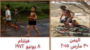 صورة “طفلة نابالم” تكررت بنفس السيناريو في اليمن لعدد من الأطفال اليمنيين وأطفال مهاجرين من القرن الأفريقي كانوا يركضون وهم يصرخون إثر حروق تعرضوا لها إثر قصف طائرات التحالف لمخيم اللاجئين والنازحين التابع للأمم المتحدة في منطقة المرزق بمحافظة حجة، بأسلحة محرمة إلا أن العالم لم يكترث لهم كما حصل مع فتاة نابالم.