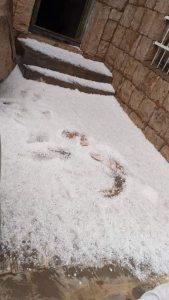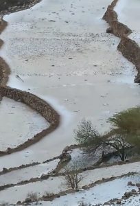 وتداول ناشطون على مواقع التواصل الاجتماعي، صوراً لمساحات واسعة من جبال وشعاب منطقة ثلا وحبابة تكسوها حبات البرد.