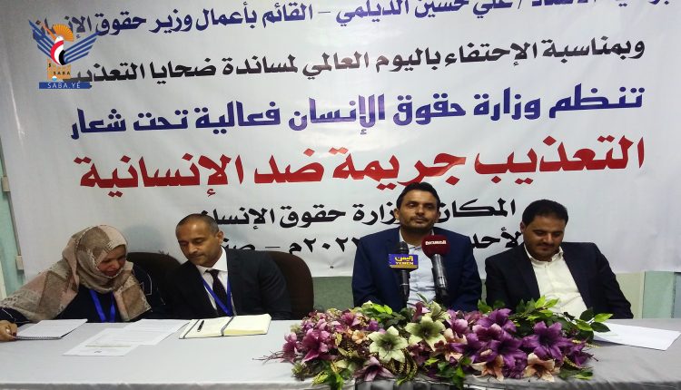 وفي الفعالية أكد القائم بأعمال وزير حقوق الإنسان علي الديلمي، أهمية مساندة ضحايا العنف للتعريف بخطورة وبشاعة جرائم التعذيب وآلية الوقوف إلى جانب من يتعرضون للتعذيب وتقديم الحماية والعون اللازم لهم.