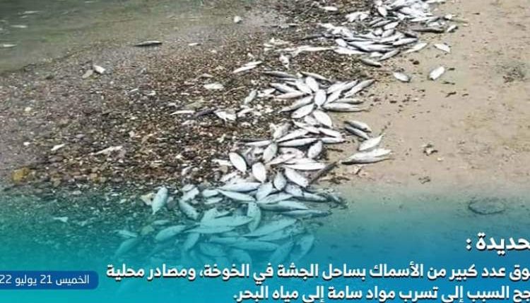 كشف مصدر في هيئة المصائد السمكية عن نفوق عدد كبير من الأسماك والأحياء البحرية بساحل الجشة في الخوخة بمحافظة الحديدة .