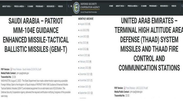 وقالت الوزارة، في بيان، إنها وافقت على صفقة بيع محتملة لـ 300 صاروخ “باتريوت” إلى السعودية، تبلغ قيمتها 3.05 مليارات دولار، وصفقة أخرى بقيمة 2.25 مليار دولار لدولة الإمارات مقابل 96 صاروخ “ثاد”.