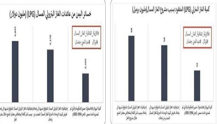 ب- بينما تظهر خسائر اليمن من ضخ 10.6 مليون طن من الغاز البترولي (بما يعادل 125 مليون برميل من الغاز البترولي) (LPG غاز الطبخ المنزلي) إلى بلحاف طبقا لخطة تثبيت الوحدات الحرارية للعقود، وكذا الكميات المتسربة بسبب ضعف كفاءة المعامل، إلى ما يقارب 9 مليارات دولار (بحساب سعر الطن 850 دولاراً حسب مايو 2022م).