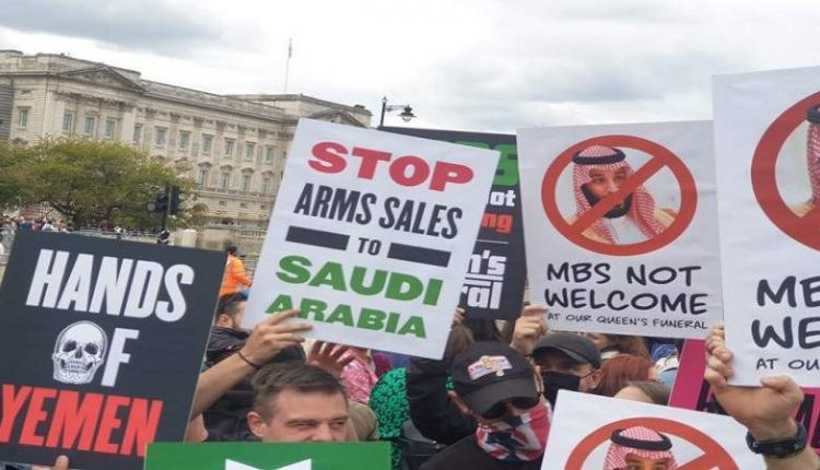 شهدت العاصمة البريطانية لندن تظاهرة حاشدة، الأحد، ضد الزيارة المقررة لبن سلمان إلى لندن من أجل تقديم العزاء في الملكة إليزابيث الثانية.