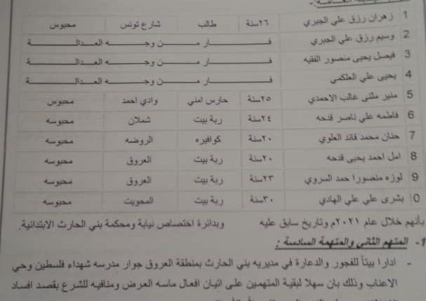 ومن بين المتهمين العشرة وفق بيان القضاء وقائمة جلسات المحكمة زهران رزق علي الجبري وسيم رزق علي الجبري وفيصل يحيى منصور الفقيه ويحيى علي العلكمي ومنير مثنى الأحمدي، وقد صدرت بحقهم أوامر “قبض قهري” في 22 فبراير 2022..وكذا منير علي الأحمدي وفاطمة علي ناصر قدحه وحنان محمد العلوي وأمل يحيى قدحه ولوزه منصور السروري وبشرى علي الهادي.