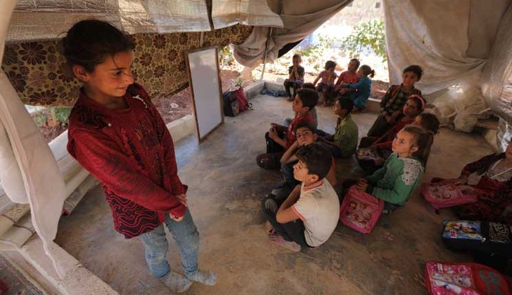 تعلم طفلة سورية في أحد مخيمات النزوح أقرانها من الطلاب القراءة والكتابة والحساب، وقد حولت خيمة إلى صف دراسي وذلك لعدم وجود مدرسة في المخيم.
