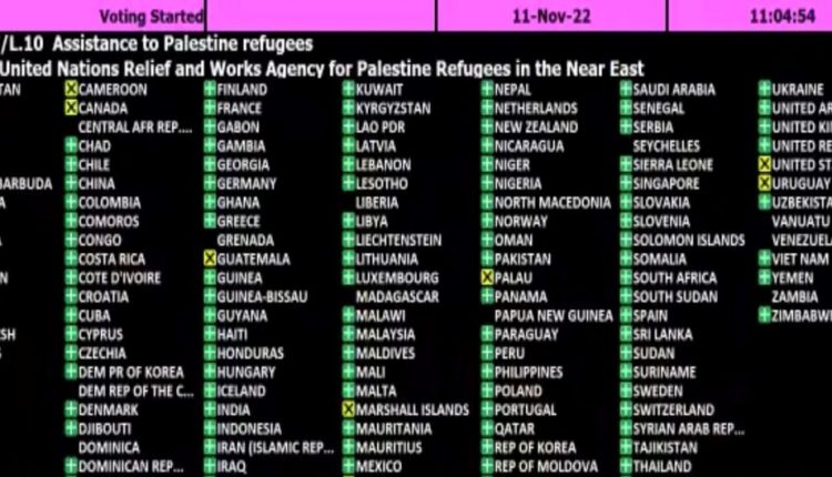 صوتت 160 دولة لصالح القرار رقم A/C.4/77/L.11 المعنون “ممتلكات اللاجئين الفلسطينيين والإيرادات الآتية منها” مع معارضة سبع دول (كندا، إسرائيل، ليبريا، جزر مارشال، ميكرونيزيا، الولايات المتحدة، ناورو) وامتناع سبع أخرى عن التصويت (الكاميرون، البرازيل، بوروندي، غواتيمالا، رواندا، توغو، جنوب السودان).