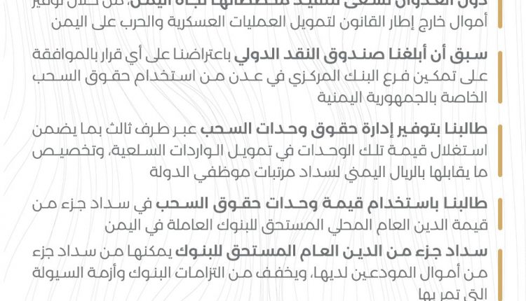 3- إيقاف أي تصرف لوحدات السحب الخاصة بالجمهورية اليمنية، وذلك إلى حين انتهاء العدوان على اليمن، وبما يكفل استفادة كامل الشعب اليمني من وحدات حقوق السحب.