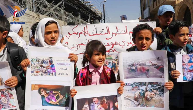 واعتبر بيان وقفة أطفال اليمن، مجازر العدوان بحق الطفولة باليمن، وصمة عار في جبين العالم المتحضر .. مؤكداً أن جرائم العدوان استمرت بفعل الضوء الأخضر والمباركة العالمية التي كان ثمنها سرقة أحلام ملايين الأطفال في اليمن.