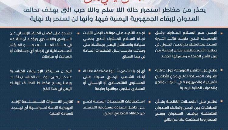 وأشار إلى أن الحرص على تحقيق السلام في اليمن ينبغي أن يتجسد من خلال الاستجابة لحقوق المواطنين وفي مقدمتها صرف المرتبات لكل موظفي الدولة، وفتح جميع المطارات والموانئ اليمنية، ورفع جميع القيود على الواردات وعلى رأسها المشتقات النفطية والمواد الغذائية والدواء عبر جميع الموانئ والمطارات وفي مقدمها ميناء الحديدة ومطار صنعاء الدولي.