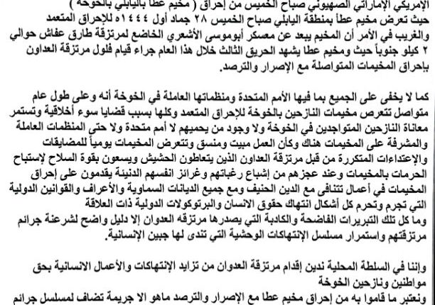 وحمل العميسي تحالف العدوان والأمم المتحدة والمنظمات الدولية العاملة في الخوخة المسؤولية الكاملة إزاء هذه الجرائم المرتكبة ضد النازحين في المخيمات بالخوخة.