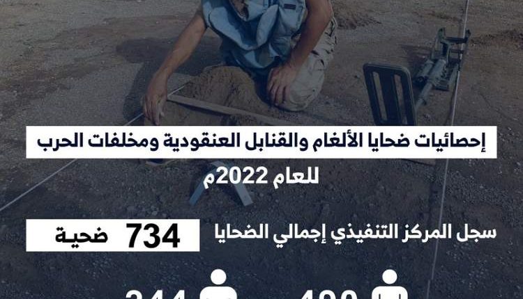 ذكر المركز التنفيذي للتعامل مع الالغام ان إجمالي ضحايا الالغام والقنابل العنقودية مخلفات التحالف في محافظة الحديدة خلال العام 2022م بلغ (734) ضحية منهم قتلى (244) و(490) مصابا
