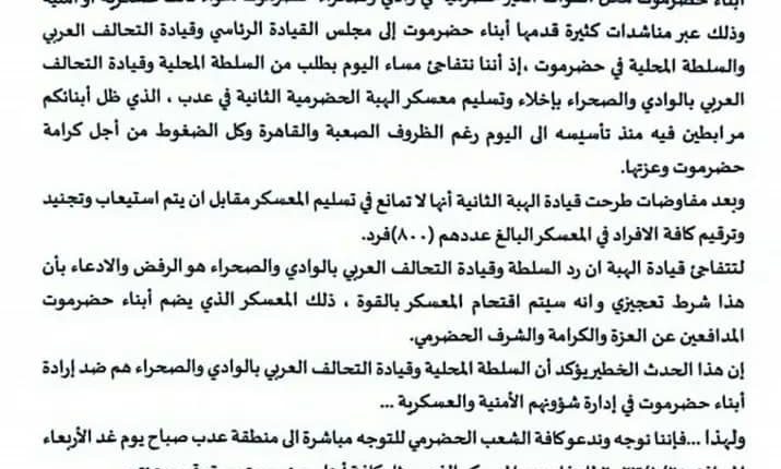 وأكد بيان صادر عن رئيس “الهبة الحضرمية” حسن الجابري، أن قيادة القوات السعودية في سيئون طالبت بإخلاء معسكر “عدب” الخاضع للهبة الذي يتواجد فيه قرابة 800 مجند، تم رفض ترقيمهم ضمن عملية التجنيد التي دعا اليها “حلف قبائل حضرموت” لعشرة آلاف من أبناء حضرموت.