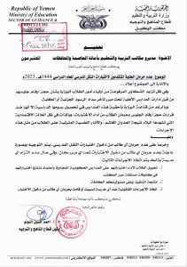 شددت وزارة التربية والتعليم في صنعاء ، على مكاتبها في أمانة العاصمة والمحافظات عدم حرمان الطلبة المتقدمين لاختبارات النقل للعام الدراسي ” 1444 هجرية – 2023م” مهما كانت الأسباب المتعلقة بالرسوم الدراسية .