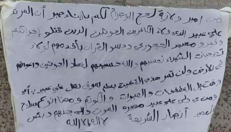 وكان فرع تنظيم القاعدة الإجرامي في لحج المحتلّة قد نشر بياناً، أمس الأحد، لما سماه أمير الولاية، يتوعد فيه الشيخ علي عبيد العزيبي، أبرز مشايخ مديرية صبر بمحافظة لحج، بالمفخخات والكواتم والعبوات الناسفة؛ في محاولة من مرتزِقة الاحتلال الإماراتي لإرهاب المواطنين وإخضاعهم لسلطة الانتقالي بعد أن فقد نفوذه فيها، كما تؤكّـد الخطوة العلاقة الوطيدة التي تربط الانتقالي بما يسمى تنظيم القاعدة والجماعات التكفيرية الإجرامية، واستخدامها كوسيلة لضرب خصومه وتصفيتهم، وذلك على غرار ما يفعله الاحتلال السعوديّ وأدواته.