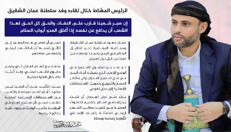 وحمّل الرئيس المشاط وفدَ الوساطة العمانية تحذيراتٍ جادةً من عواقب الاستمرار بالمماطلة ورفض تنفيذ مطالب الشعب اليمني، حَيثُ أكّـد أن “صبر الشعب اليمني قارب على النفاد، والحق كُـلّ الحق لهذا الشعب أن يدافع عن نفسه إذَا أغلق العدوّ أبواب السلام”.