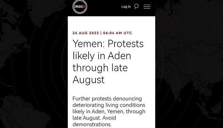وقالت مؤسسة (GardaWorld Crisis24)، المتخصصة في معلومات الأمان العالمية، إنه “من المرجح أن تشهد عدن المزيد من الاحتجاجات المنددة بتدهور الظروف المعيشية، حتى أواخر أغسطس الجاري”، مضيفة أنه “لا يزال من المحتمل حدوث المزيد من الاحتجاجات المنددة بالظروف المعيشية وانقطاع التيار الكهربائي في عدن حتى أواخر أغسطس الجاري”، بعد التظاهرات ذات الصلة في الأيام الأخيرة.