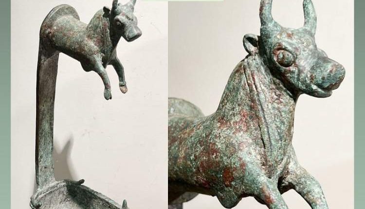 كما عرض مصباح زيت برونزي يعلوه الجزء الأمامي من ثور ، “من القرن الثالث – الثاني قبل الميلاد ، بارتفاع 33 سم ؛ طول مقدمة الثور 11 سم والمصباح 17.5 سم ، وقد تم إعادة ربط المصباح (المتشقق قليلاً) والثور” ، وكلها من مقتنيات شلومو موساييف.
