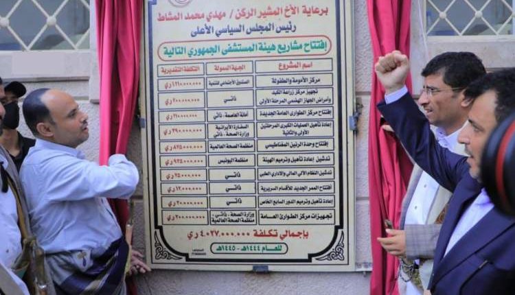 وافتتح الرئيس المشاط ومرافقوه، مشروع إعادة تأهيل وترميم الهيئة بقيمة 935 مليون ريال بتمويل من مكتب الأمم المتحدة لخدمات المشاريع “اليونبس”، والمرحلة الأولى والثانية من مشروع إعادة تأهيل العمليات الكبرى بقيمة 390 مليون ريال بتمويل من السفارة الإيرانية ووزارة الصحة وهيئة المستشفى الجمهوري.
