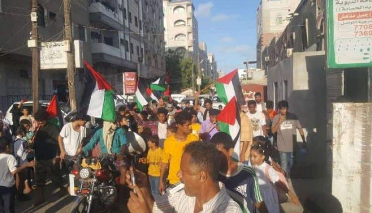 وجاب متظاهرون شوارع مدينة المنصورة في محافظة عدن رافعين الاعلام الفلسطينية ومرددين هتافات دعما للمقاومة الفلسطينية وتندد بالانظمة العربية المطبعة مع الكيان المحتل .