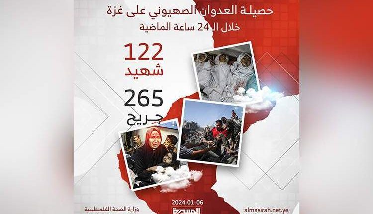 أعلنت وزارة الصحة الفلسطينية، اليوم السبت، أن العدو الصهيوني ارتكب خلال الـ أربع والعشرين ساعة الماضية 12 مجازر ضد العائلات في قطاع غزة راح ضحيتها 122 شهيدا و256 مصابا.