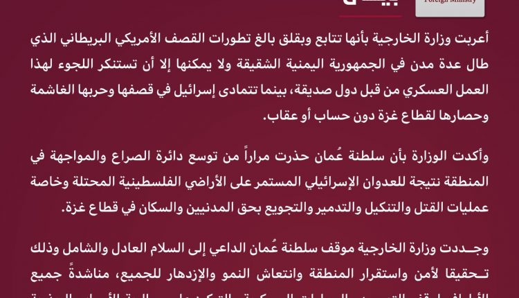وقالت الوزارة في بيان لها اليوم الجمعة: “تتابع سلطنة عُمان وبقلق بالغ تطورات القصف الأمريكي البريطاني الذي طال عِدة مدن في الجمهورية اليمنية الشقيقة ولا يمكنها إلا أن تستنكر اللجوء لهذا العمل العسكري من قِبَلِ دول صديقة، بينما تتمادى (إسرائيل) في قصفها وحربها الغاشمة وحصارها لقطاع غزة دون حساب أو عقاب”.