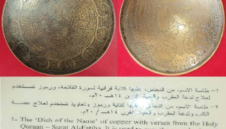 ومن هذه القطع التاريخية النادرة إناءين من النحاس لشرب الماء يتراوح حجم قطرها مابين 7 الى 10 سم وعمقها الى 5 سم كتب على هذان الإناءين رسومات لحيوانات مختلفة وزواحف مثل العقارب والافاعي وايات قرانية وتعاويذ وطلاسم ورموز بالعربية والعبرية وحتى المسندية .