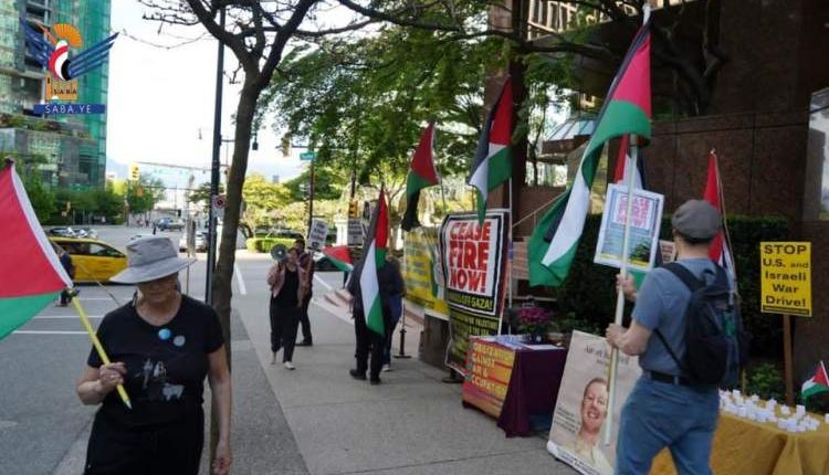 أقام ناشطون سلميون، الإثنين، وقفة احتجاجية رمزية معبرة أمام القنصلية الأمريكية في مدينة فانكوفر الكندية للتضامن مع فلسطين واليمن، وإحياء للذكرى الـ76 للنكبة في فلسطين.