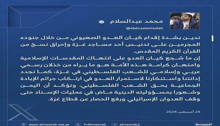 أدان رئيس الوفد الوطني المفاوض محمد عبدالسلام بشدة إقدام كيان العدو الصهيوني على تدنيس أحد مساجد غزة وإحراق نسخ من القرآن الكريم.