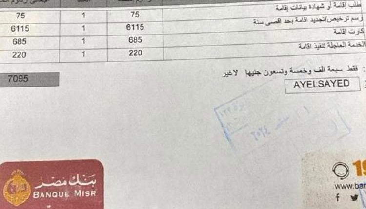 وحسب تعميم صادر عن بنك مصر، فإن رسوم تجديد الإقامة ارتفعت بشكل مفاجئ من 1870 جنيهاً مصرياً (ما يعادل 40 دولاراً) إلى 7095 جنيهاً (قرابة 150 دولاراً) للفرد الواحد، في حين كان السعر القديم سارياً حتى يوم الخميس الماضي.
