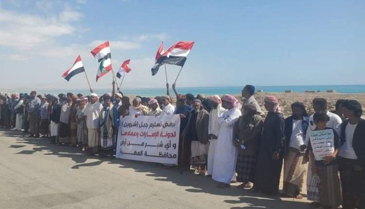 نظم أبناء وقبائل مديرية قشن في محافظة المهرة وقفة احتجاجية سلمية؛ تعبيراً عن رفضهم القاطع لتسليم موقع في منطقة “ليبن” بجبل شروين لشركة إماراتية لإنشاء مشروع لسان بحري في المديرية.