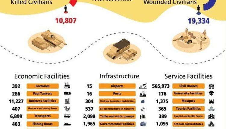 The number of civilian homes destroyed and damaged by the aggression amounted to 565,973 houses, while service facilities amounted to 576,528 facilities, the report showed, adding that the aggression led to the destruction of 176 university facilities, 1,375 mosques, 365 tourist facilities and 389 hospitals and health facilities.