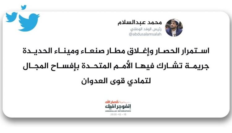 In a tweet on Tuesday, he said the “UN is complicit in the crime of blockade on Yemen.” ,describing the closure of Sanaa Airport and Hodeidah Port as crimes, blasting the UN for not bearing its responsibility in preventing such crime.