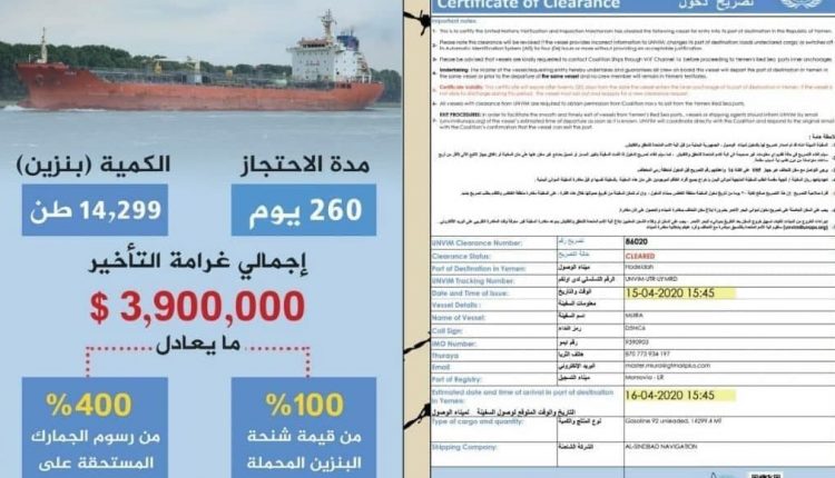 The spokesman of the Yemeni Oil Company, Essam al-Mutawakil declared that the total fines for delaying the seizure of the vessel “Miura” amounted to (3,900,000) dollars, confirming that the ship arrived to Hodeidah port and laboratory examination procedures are being completed to ensure that the materials meet the approved specifications, so that the unloading process can then begin.
