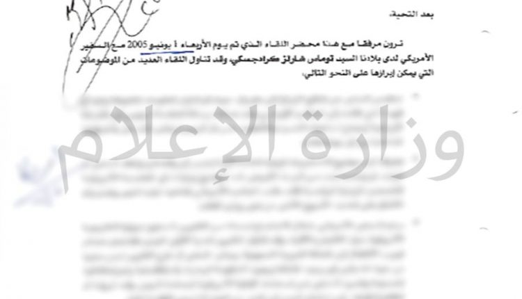 The documents revealed by the Ministry of Information include a memorandum classified under the title “Urgent” issued by the US Embassy in Sana’a on November 4, 2007, addressed to the Yemeni Foreign Ministry. Arabic in the Central District Office in Damascus from 5 to 7 November 2007 AD.