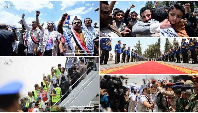 An official and popular gathering went to receive the prisoners at Sana’a International Airport, presented by members of the Supreme Political Council, the Prime Minister, Chief of Staff Major General Muhammad al-Ghamari, senior state officials, and military and political leaders.
