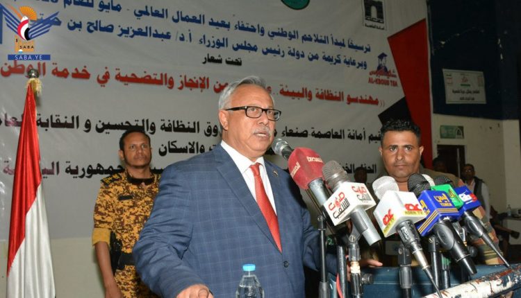 This came during his participation in the rhetorical and honoring ceremony for the cleaning and improvement workers in the Republic of Yemen, which was held today by the capital Sanaa, represented by the Cleaning and Improvement Fund and the General Union of Municipal and Housing Workers.