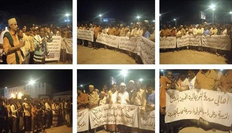 On Tuesday, residents of the city of Al-Dish gathered in the city of Mukalla, the capital of Hadramout governorate, in angry protests, denouncing the complete power outage in the city, and the unprecedented deterioration of their living conditions.