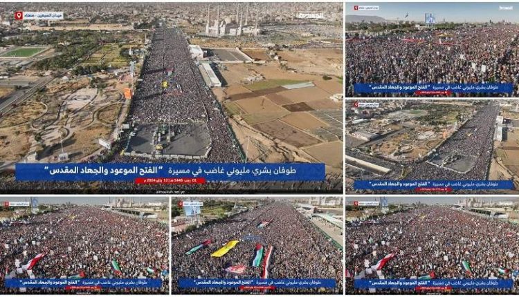 Pro-Palestine millions-persons popular marches took place in Sanaa and other governorates, on Friday, denouncing the American-British aggression on Yemen, under the slogan “The Promised Victory and the Sacred Jihad.”